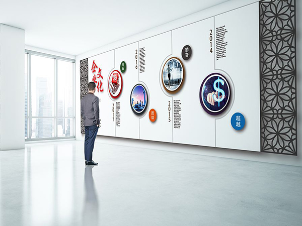 根据走廊区域的特点,可以在一个墙面上创建文化隔板墙,尤其重要可以创建强调装饰效果和企业文化的装饰墙。